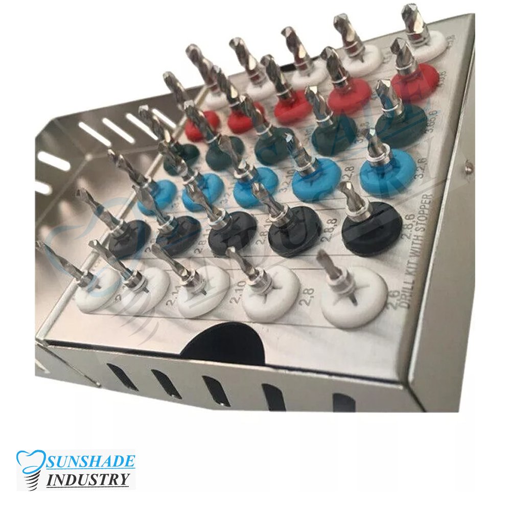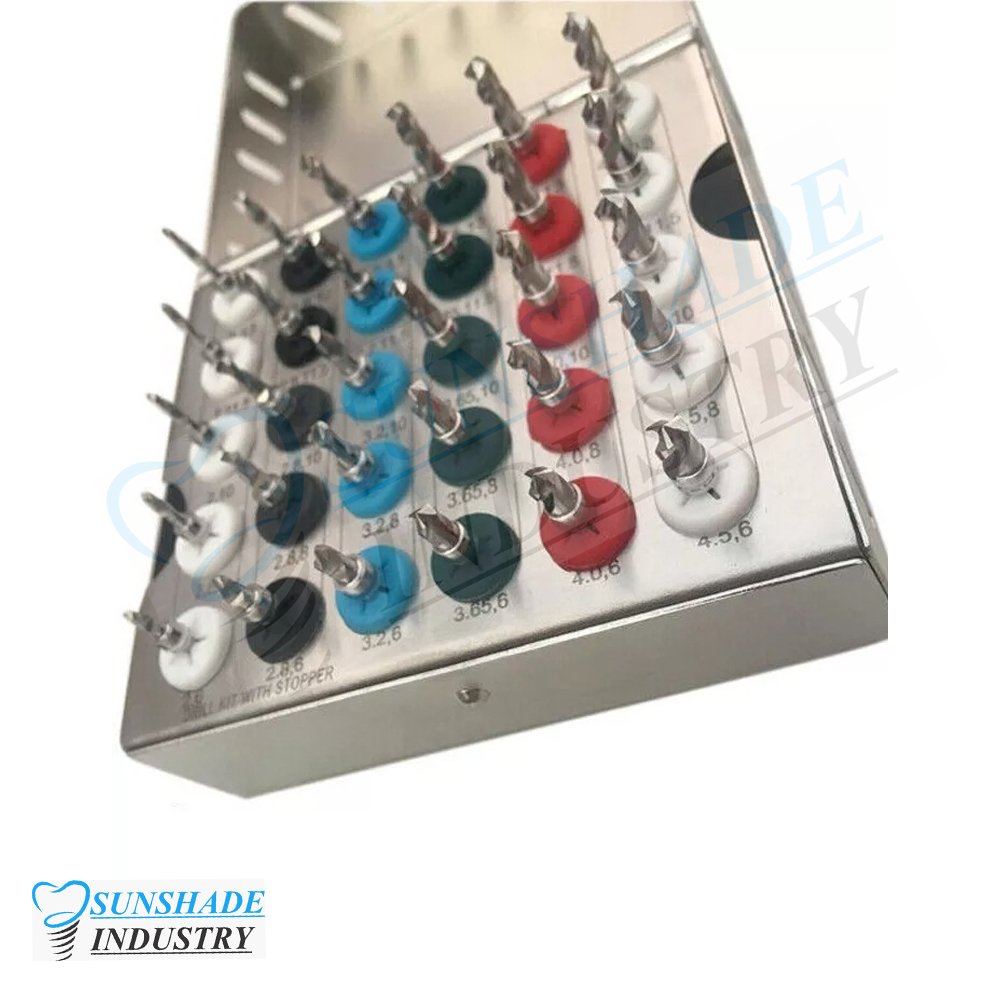 The Sunshade Industry 30 Pcs Dental Implant Twist Drill Kit is a high-precision surgical instrument system designed for accurate implant osteotomy preparation. Featuring a 4mm stopper system and multiple diameter & length combinations, this smart drill kit ensures controlled drilling depth and improved surgical safety.